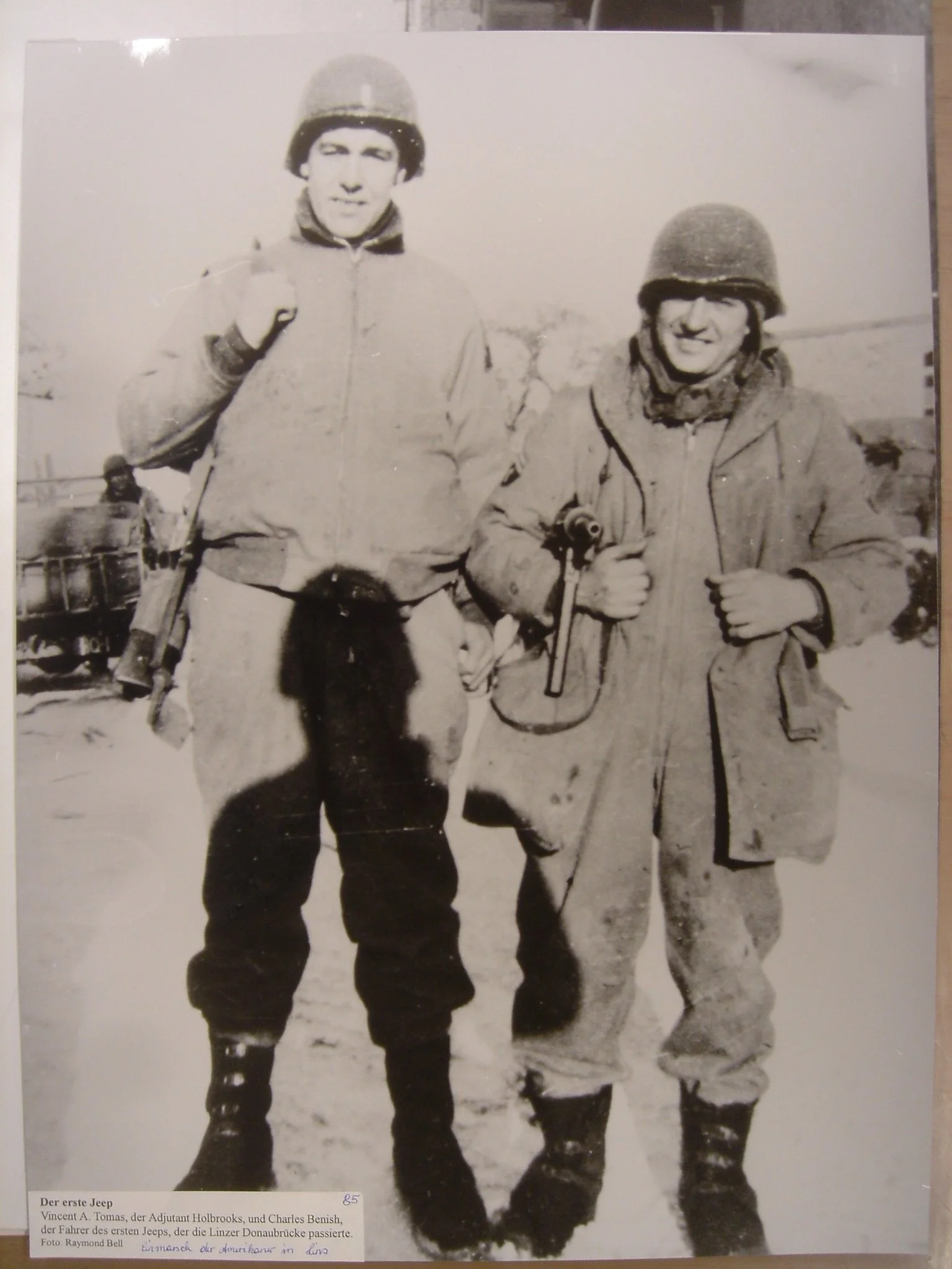 (Der Jeep nähert sich:) Mein erster Impuls: Weg. Weglaufen! Ludwig nimmt mich an der Hand: ein etwas feuchter, fester Griff. Der Mann sagt: „Steigts ein, ihr zwei, los, sonst wirds brenzlig“. Ludwig hat eine etwas rauhe Stimme, als er fragt:“Wer sind Sie denn?“ Der Mann lächelt: „Ich bin der Ernst Koref, der neue Bürgermeister von Linz. Wollts meine Urkunde sehen?“
